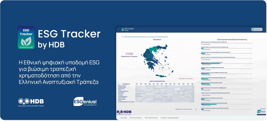 Το ESGenius! – The Sustainability OS είναι μία προηγμένη ψηφιακή πλατφόρμα ESG και κλιματικής νοημοσύνης που ενδυναμώνει τη βιώσιμη τραπεζική. Μέσω της υιοθέτησής του από την Ελληνική Αναπτυξιακή Τράπεζα, δημιούργησε τα ESG Tracker και Carbon Tracker, προσφέροντας επαληθευμένο ESG scoring, υπολογισμό ανθρακικού αποτυπώματος και δεδομένα ανθεκτικότητας κλιματικών κινδύνων. Πάνω από 12.000 επιχειρήσεις έχουν συμμετάσχει, δημιουργώντας τη μεγαλύτερη εθνική ESG & climate data υποδομή για τραπεζική χρήση, αναδεικνύοντας την ελληνική καινοτομία σε πρότυπο βιώσιμης τραπεζικής σε εθνικό ευρωπαϊκό επίπεδο.